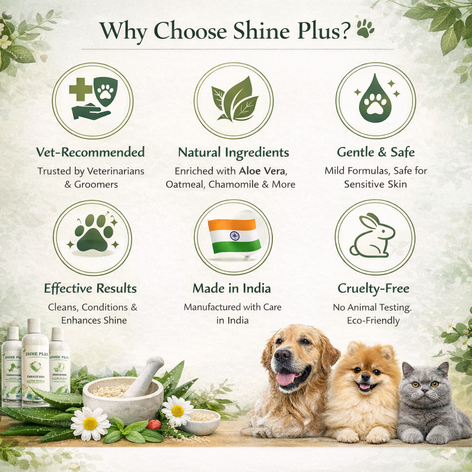 Proudly Manufactured in India and Headquartered in Goregaon, Mumbai, Shine Plus blends science with nature to deliver mild, Effective, and coat-Friendly Grooming products designed for pets of all breeds and sensitivities.